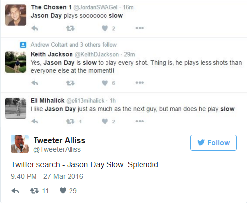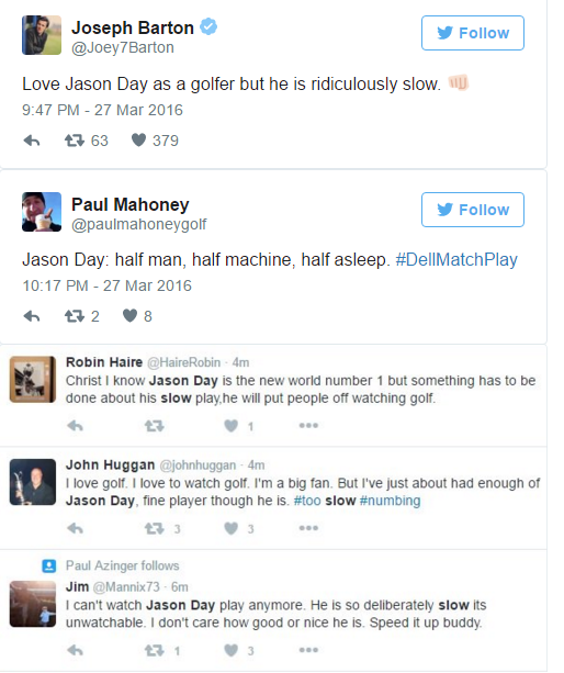 Mörgum finnst Day vera gríðarlega hægur á golfvellinum en hann er þekktur fyrir að taka sér góðan tíma í hvert högg. Eftir mót helgarinnar missti fólk þolinmæðina og samfélagsmiðlarnir fylltust af tuði yfir leikhraða Day.