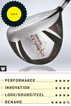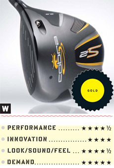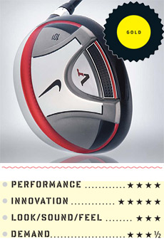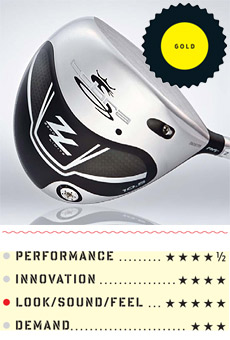 Umsögn: The back edge's external sole weight pad is designed to increase off-center hit stability. But the hidden boost to MOI comes from a lighter shaft that shifts the balance point toward the grip yet still allows for a heavier head and an unchanged swingweight. The theory: More mass delivered to the ball at the same speed.