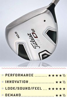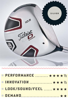 Umsögn: Titleist's all-titanium line features two versions. The D2 has a shallow face and a deeper CG for stability on off-center hits. The D3 has a deep face but is slightly smaller at 440 cubic centimeters, and the CG is closer to the face to help golfers work the ball. Both have a milled face insert with a thick internal trapezoidal ring in the center to improve ball speed.